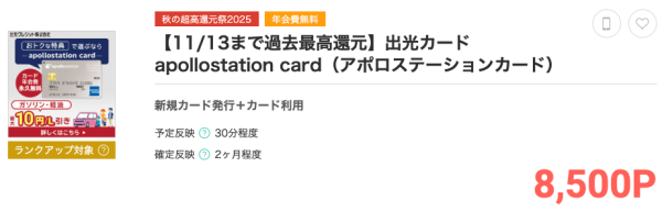 「出光」のガソリンスタンドでガソリン代が値引きされる「apollostation card(アポロステーションカード)」をお得に発行できます。