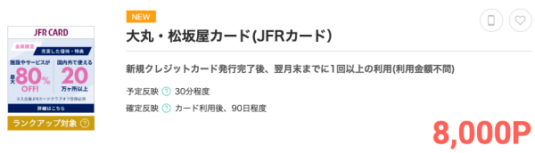 「大丸松坂屋カード(JFRカード)」は、有名デパート「大丸松坂屋」のクレジットカードで、ポイントサイト「モッピー」のサイト内にある広告を経由してカードを発行すると、モッピーからポイントがもらえます