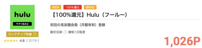モッピーのサイト内に掲載された「Hulu」の広告を経由して新規有料会員登録が完了すると1,026円相当のモッピーポイントがもらえます。