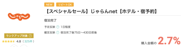 さらにモッピーのサイト内に掲載されている「じゃらんnet」の広告経由で宿泊予約を使えば宿泊料金の2.7%分がモッピーポイントでもらえるため、じゃらんnetでのポイント還元も含めてポイントの二重取りができます