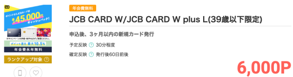 モッピーのサイト内に掲載されているJCB CARD Wの広告を経由してから発行すると、モッピーポイントで6,000ポイントがもらえます。