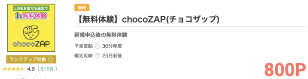 現在、モッピーではchocozapへ新規申込後の無料体験利用で800円分のポイントがもらえます。