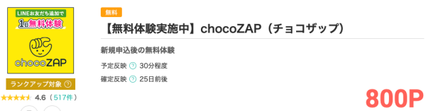 現在、モッピーではchocozapへ新規申込後の無料体験利用で800円分のポイントがもらえます(※時期によってポイント数は変動します)。