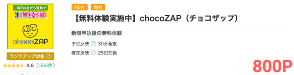 現在、モッピーではchocozapへ新規申込後の無料体験利用で800円分のポイントがもらえます(※時期によってポイント数は変動します)。