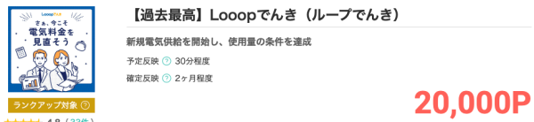 Looopでんきの利用開始と使用料達成でもらえるモッピーポイント