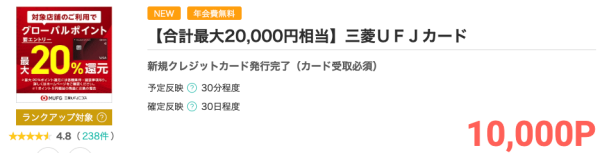 ポイントサイト「モッピー」サイト内に掲載された広告を経由した「三菱UFJカード」の発行でモッピーからポイントがもらえて、公式サイトでも条件達成で新規入会特典としてポイントがもらえます。