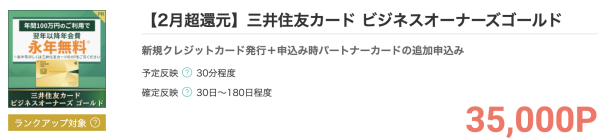 三井住友カードビジネスオーナーズゴールドをモッピー経由で発行すると35,000円相当のポイントがもらえて、さらに公式サイトのキャンペーンでもカード入会月と3ヶ月後末までのショッピング利用で最大55,000円相当のポイントがもらえます。