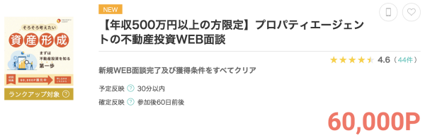 今ならモッピー経由でプロパティエージェントの開催する個別面談へ申し込んで条件を達成すると、6万円相当のモッピーポイントがもらえます。