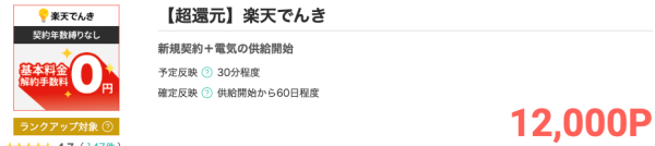 ポイント獲得条件は、楽天でんきの新規契約と120日以内の電気供給開始完了となります。