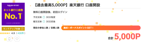 今ならモッピーに掲載されている楽天銀行の広告を経由して口座開設後にログイン完了という条件を達成すると、モッピーから5,000円相当のポイントがもらえます。