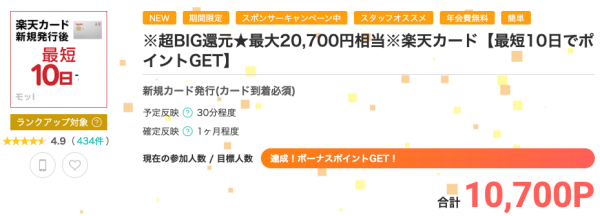 モッピーのサイト内に掲載された「楽天カード」の広告を経由して申し込むと、公式サイトとモッピーから合計最大20,700円相当のポイントがもらえるので、ぜひ利用してみてください。