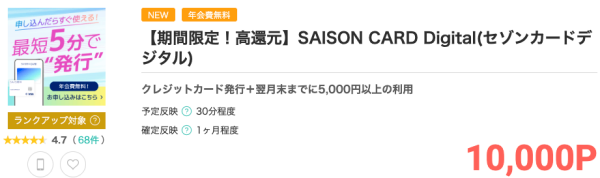 ポイントサイト「モッピー」のサイト内に掲載されている「セゾンカードデジタル(SAISON CARD Digital)」の広告を経由してカード発行後、翌月末までに5000円以上のショッピング利用をすると、モッピーからポイントがもらえます。