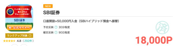 今ならモッピーに掲載されているSBI証券の広告を経由してから新規口座開設後にハイブリッド預金へ5万円を入金すると、1万8,000円相当のモッピーポイントがもらえます。