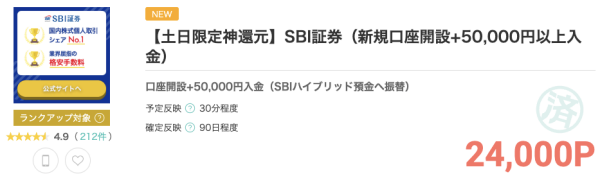 今ならモッピーに掲載されているSBI証券の広告を経由してから新規口座開設後にハイブリッド預金へ5万円を入金すると、24,000円相当のモッピーポイントがもらえます。