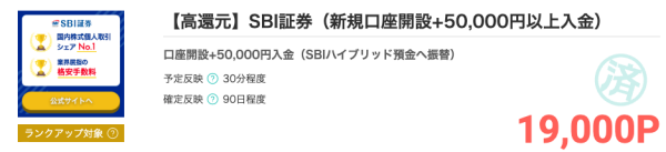今ならモッピーに掲載されているSBI証券の広告を経由してから新規口座開設後にハイブリッド預金へ5万円を入金すると、19,000円相当のモッピーポイントがもらえます。