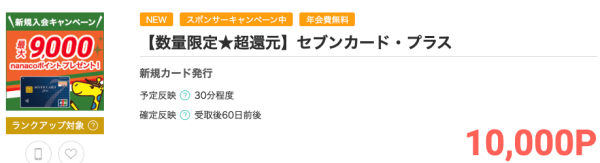 今ならモッピーを経由して発行することで10,000円相当のモッピーポイントがもらえて、さらに公式サイトから最大9,000円相当のnanacoポイントがもらえるため、新規入会キャンペーンで合計最大19,000円相当のポイントがゲットできます。