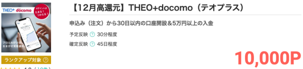THEO+docomoの口座は、ポイントサイト「モッピー」を経由で新規開設してから入金を完了すると、モッピーポイントがもらえます。