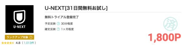 今回の案件で言うと、モッピー会員がモッピーに掲載された「U-NEXT[31日間無料お試し]」の広告を経由して無料トライアルの登録が完了すると広告利用の条件達成になります。