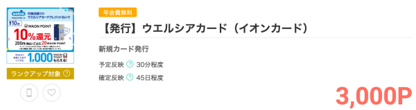 今ならモッピー経由でウエルシアカードを初回発行すると、モッピーから3,000円相当のポイントがもらえて、公式サイトのキャンペーンではもれなく1,000円相当のWAONポイントがもらえます。