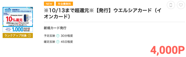 今ならモッピー経由でウエルシアカードを初回発行すると、モッピーから4,000円相当のポイントがもらえて、公式サイトのキャンペーンではもれなく1,000円相当のWAON POINTがもらえます。